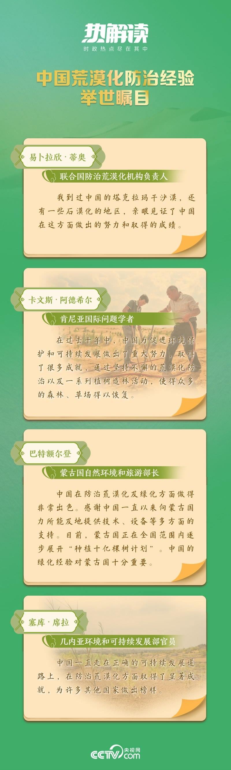 從“荒漠化防治是人類功在當(dāng)代、利在千秋的偉大事業(yè)”,到“防治荒漠化是人類面臨的共同挑戰(zhàn),需要國際社會攜手應(yīng)對”,再到“堅持系統(tǒng)觀念,扎實(shí)推進(jìn)山水林田湖草沙一體化保護(hù)和系統(tǒng)治理”……在習(xí)近平生態(tài)文明思想指引下,中國積極行動,形成了政府主導(dǎo)、全民參與、科技支撐、法規(guī)保障的治沙模式,取得了顯著成效。