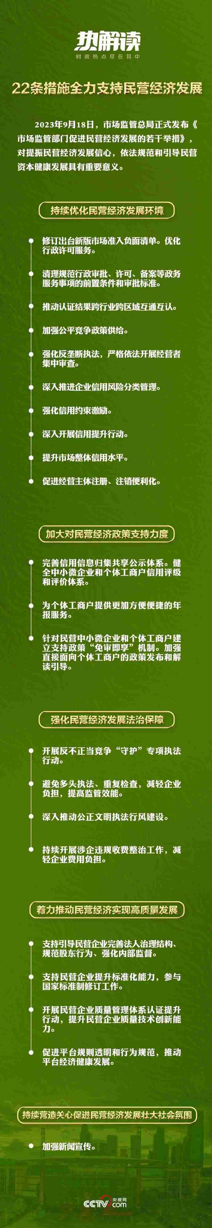2023年7月14日,中共中央國(guó)務(wù)院出臺(tái)《關(guān)于促進(jìn)民營(yíng)經(jīng)濟(jì)發(fā)展壯大的意見(jiàn)》,對(duì)促進(jìn)民營(yíng)經(jīng)濟(jì)發(fā)展壯大作出新的重大部署。2023年9月18日,市場(chǎng)監(jiān)管總局發(fā)布《市場(chǎng)監(jiān)管部門促進(jìn)民營(yíng)經(jīng)濟(jì)發(fā)展的若干舉措》,通過(guò)22條措施為全力支持民營(yíng)經(jīng)濟(jì)發(fā)展設(shè)計(jì)了具體落實(shí)的“施工圖”。