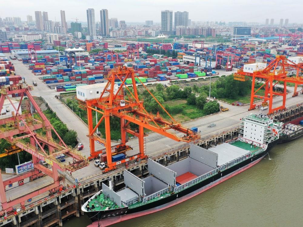 “華航漢亞2號”貨輪停靠在武漢新港陽邏集裝箱碼頭進行裝箱作業(yè)(2020年5月9日攝,無人機照片)。新華社發(fā)(趙軍 攝)