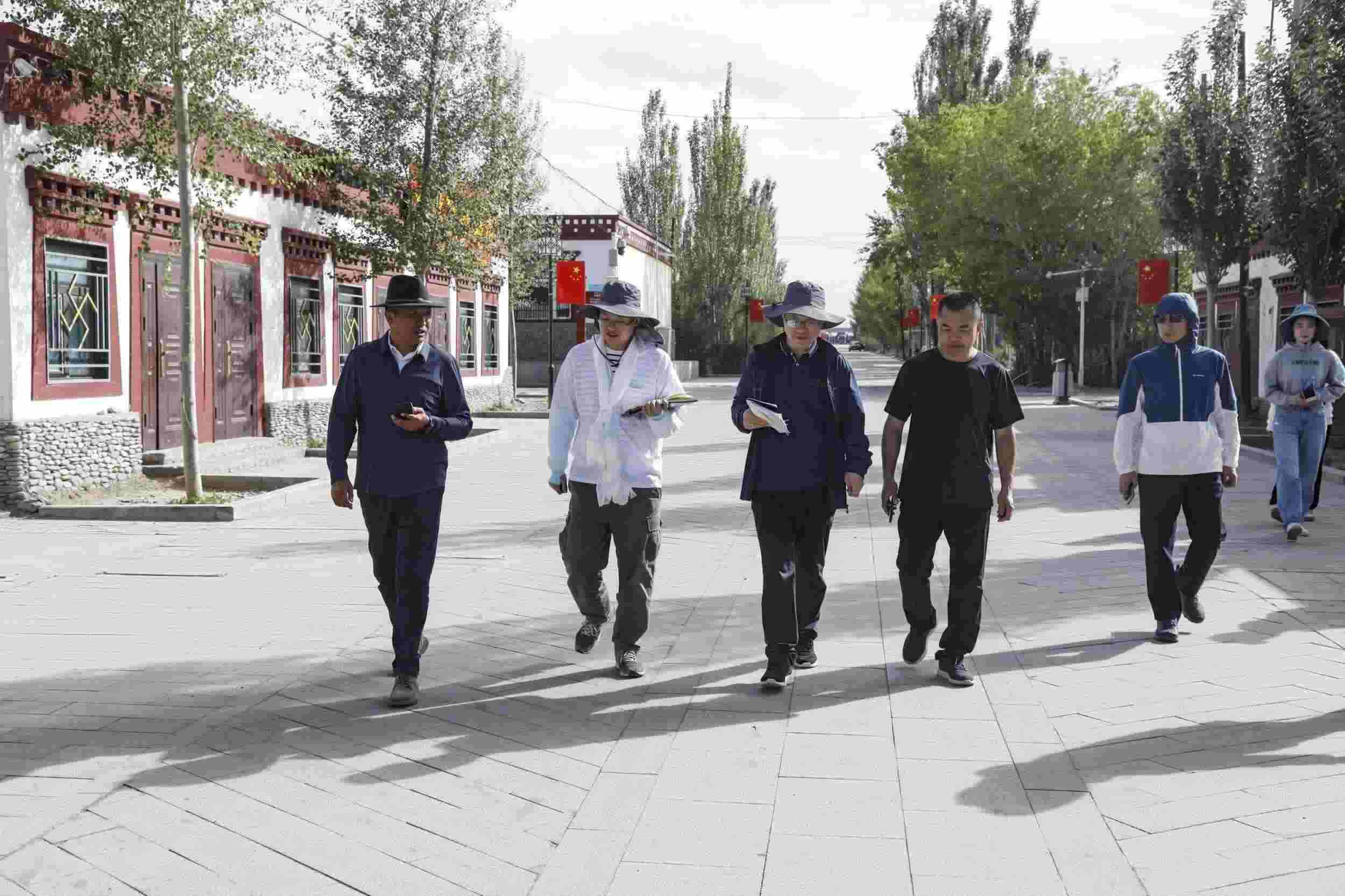 2023年7月22日,格爾木市長江源民族學校校長李軍(左三)講解該校以生態(tài)文明為特色的校園文化。王箏 攝