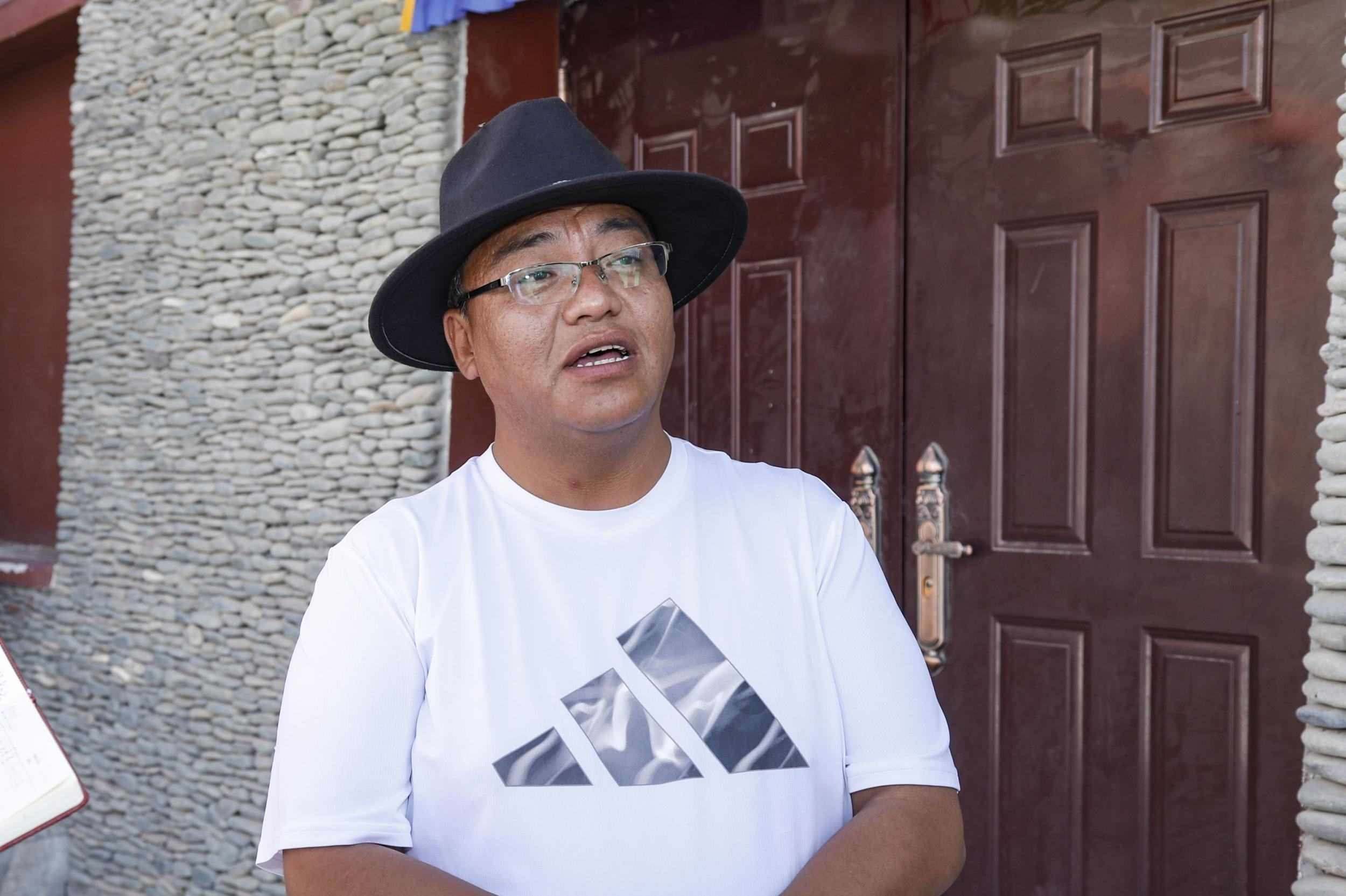 2023年7月22日,在長江源村文化廣場前,唐古拉山鎮(zhèn)黨委書記索南東主分享他參與長江生態(tài)保護的心得。王箏 攝