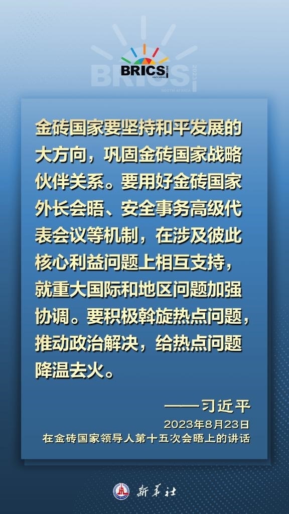 國家主席習近平23日在南非約翰內(nèi)斯堡舉行的金磚國家領(lǐng)導人第十五次會晤上發(fā)表講話指出,金磚合作正處于承前啟后、繼往開來的關(guān)鍵階段。我們要把握大勢,引領(lǐng)方向,堅守聯(lián)合自強的初心,加強各領(lǐng)域合作,推進高質(zhì)量伙伴關(guān)系,推動全球治理變革朝著更加公正合理的方向發(fā)展,為世界注入更多確定性、穩(wěn)定性、正能量。