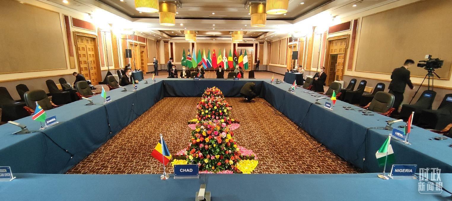 △中非領(lǐng)導(dǎo)人對話會會場擺放的與會各方旗幟。(總臺央視記者郭鴻拍攝)