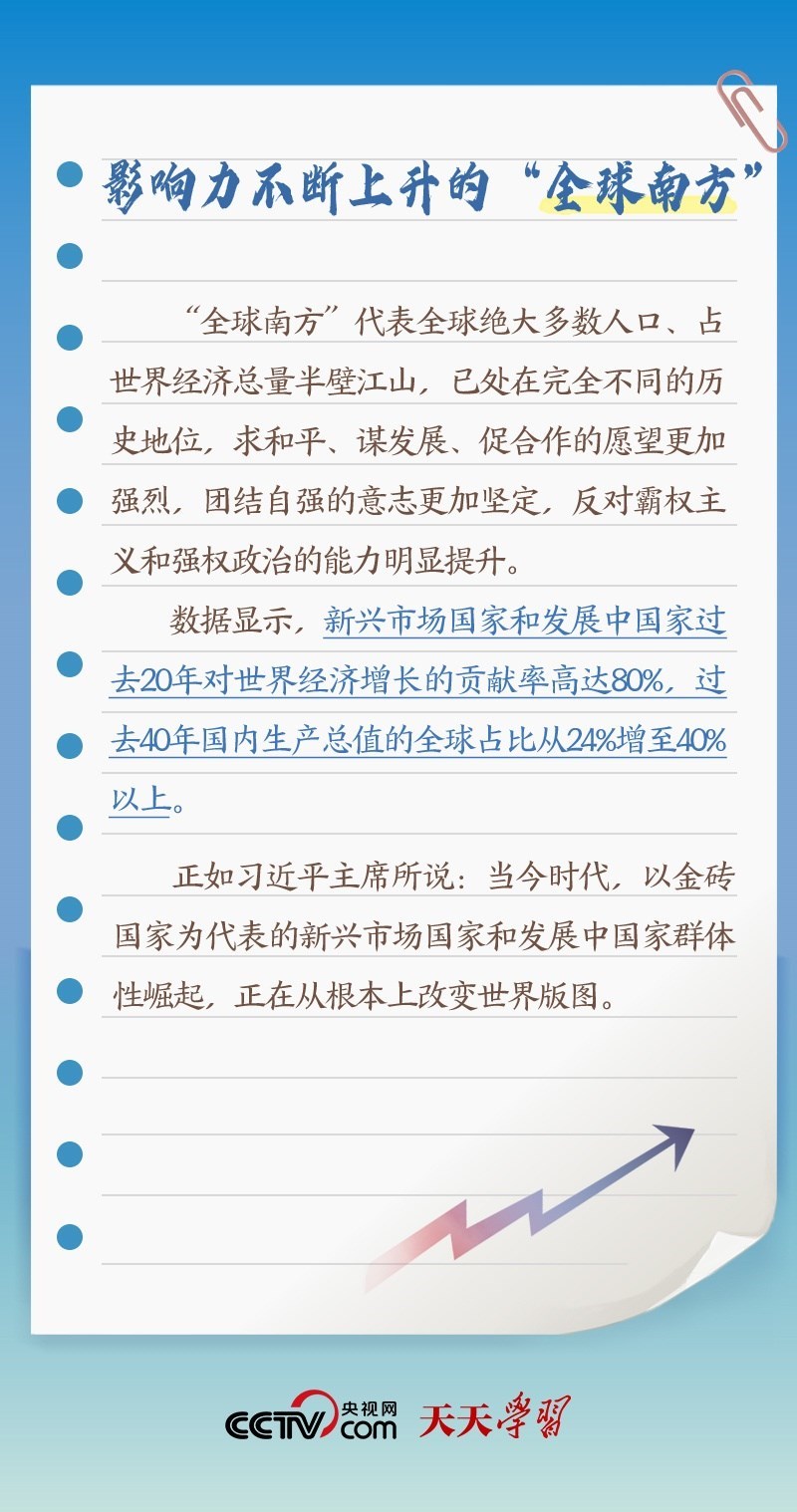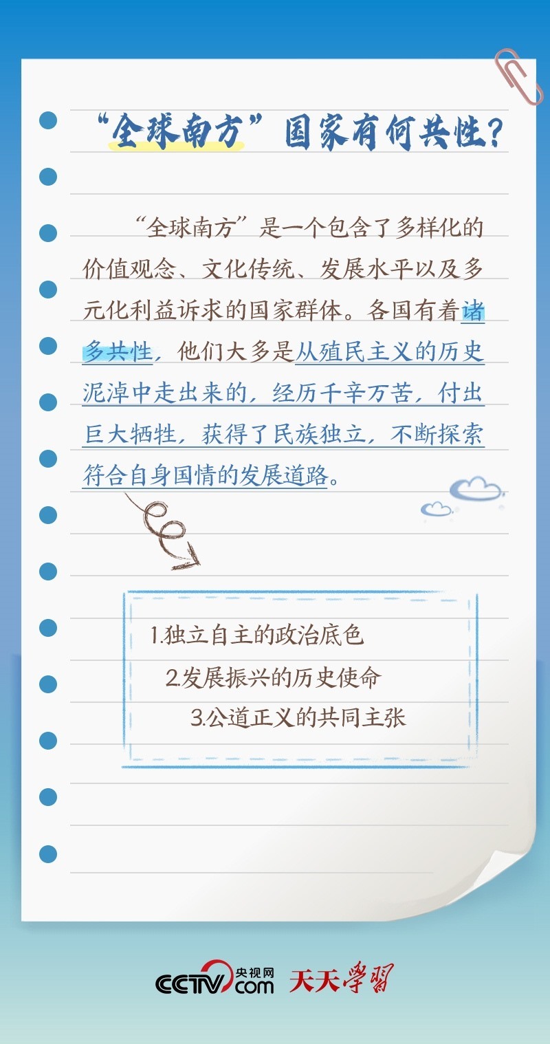 此次出訪,習(xí)近平主席在向約翰內(nèi)斯堡金磚國家工商論壇閉幕式發(fā)表致辭、同南非總統(tǒng)拉馬福薩共同會見記者等場合均提及“全球南方”。什么是“全球南方”?“全球南方”國家有何共性?中國為何是“全球南方”的天然成員?跟著央視網(wǎng)《天天學(xué)習(xí)》一起了解。