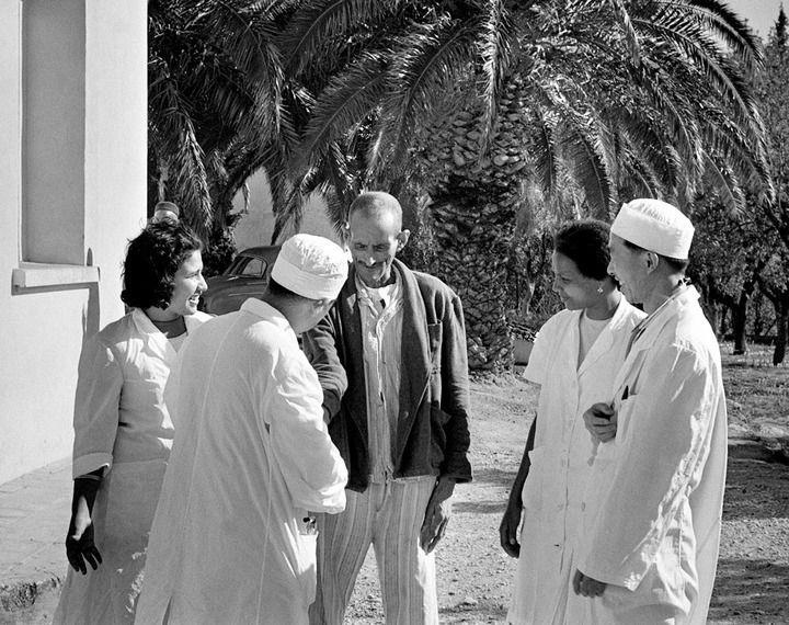 △1966年12月,一名阿爾及利亞老人向中國(guó)援非醫(yī)療隊(duì)醫(yī)生表達(dá)自己病況好轉(zhuǎn)的愉快心情。