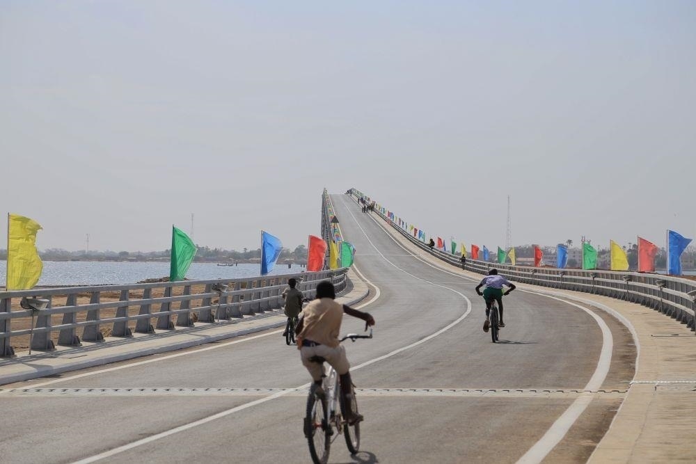 △2022年1月16日,人們騎車通過(guò)位于塞內(nèi)加爾方久尼市、由中國(guó)公司承建的方久尼大橋。