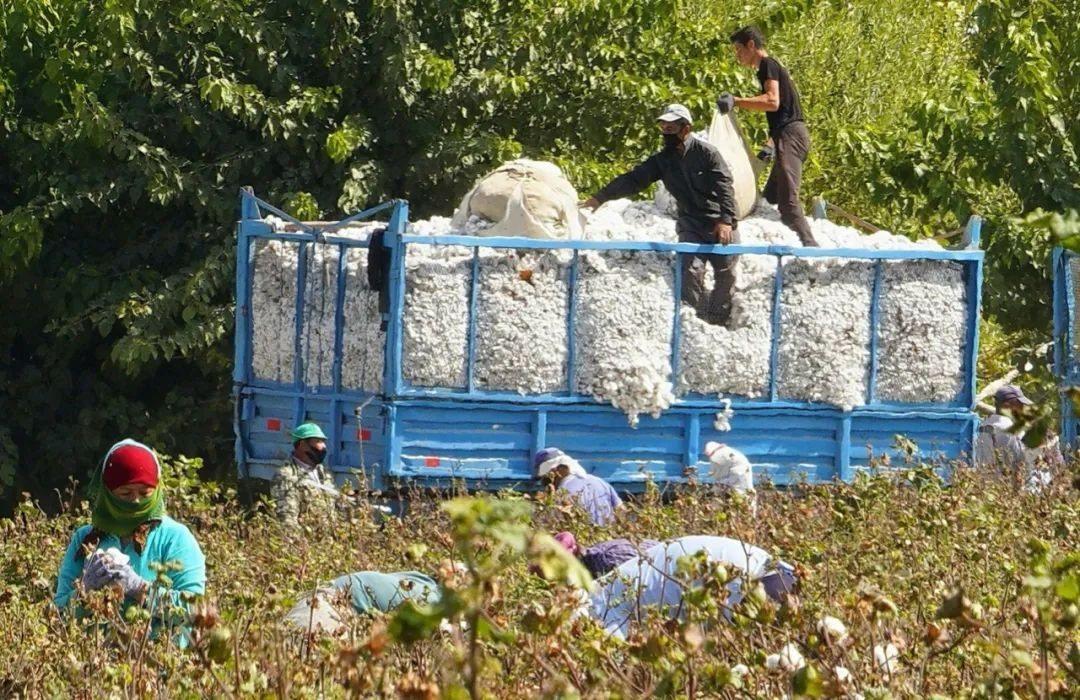 △2020年9月24日,在烏茲別克斯坦錫爾河州,棉農(nóng)在使用中國(guó)滴灌技術(shù)的棉田里采摘新棉。