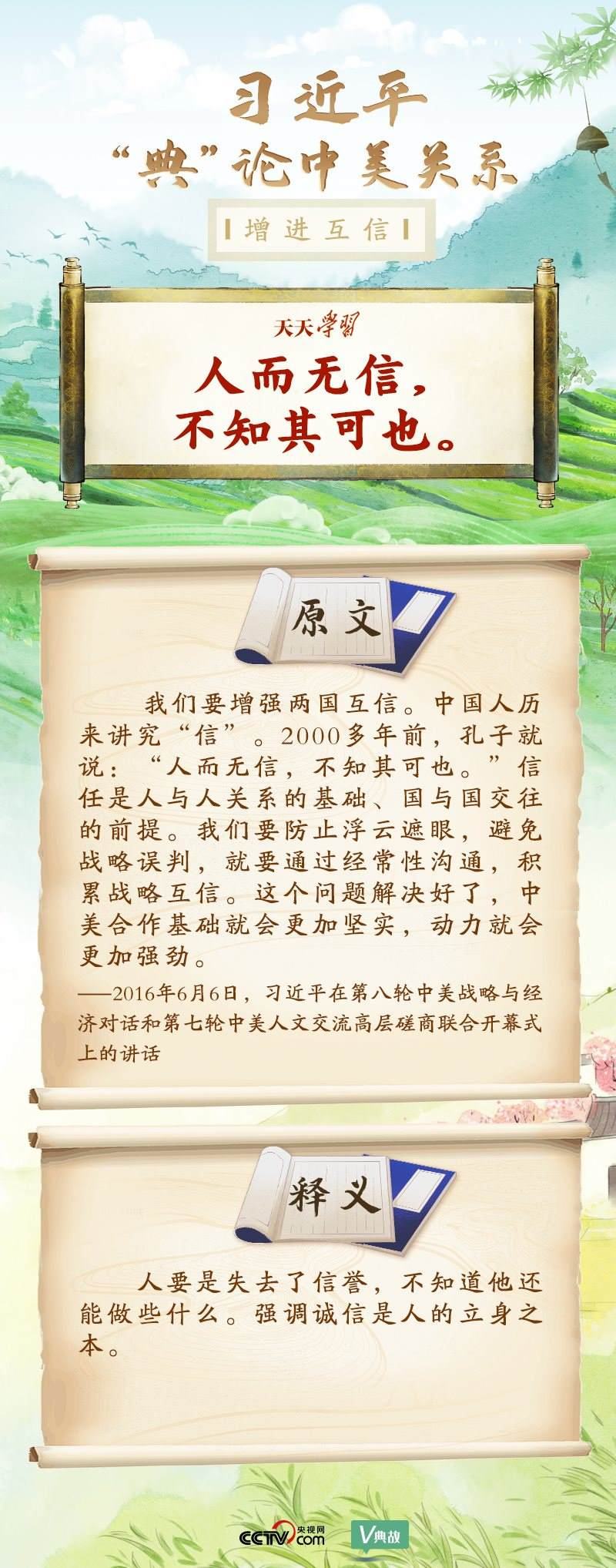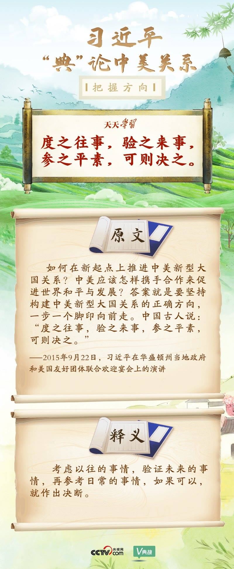 黨的十八大以來,習近平主席就中美關系發(fā)表了一系列重要講話。他站在時代高度分析、研判中美關系現(xiàn)狀及發(fā)展趨勢,并引經據(jù)典為發(fā)展中美關系指出正確方向。這些論述蘊含深刻的戰(zhàn)略思維和政治智慧,具有重大現(xiàn)實意義和深遠歷史意義。央視網《天天學習》與您一起深刻領會。