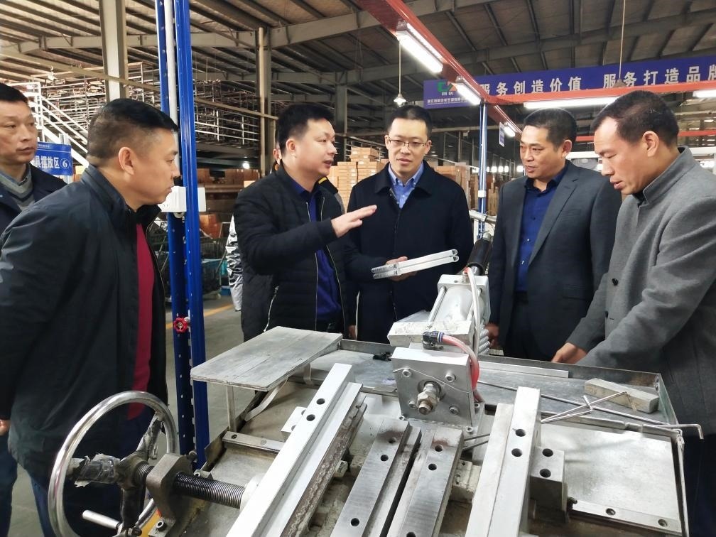 熊樹(shù)生(左三)在龍泉市一家企業(yè)車間內(nèi)介紹汽車空調(diào)冷凝器。受訪者供圖