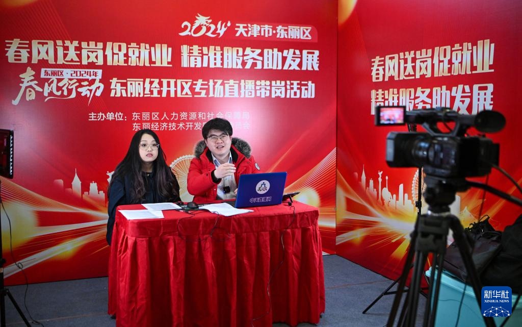 ??2024年2月29日,主播在天津市東麗區(qū)一場(chǎng)招聘會(huì)上進(jìn)行直播帶崗。新華社記者 孫凡越 攝