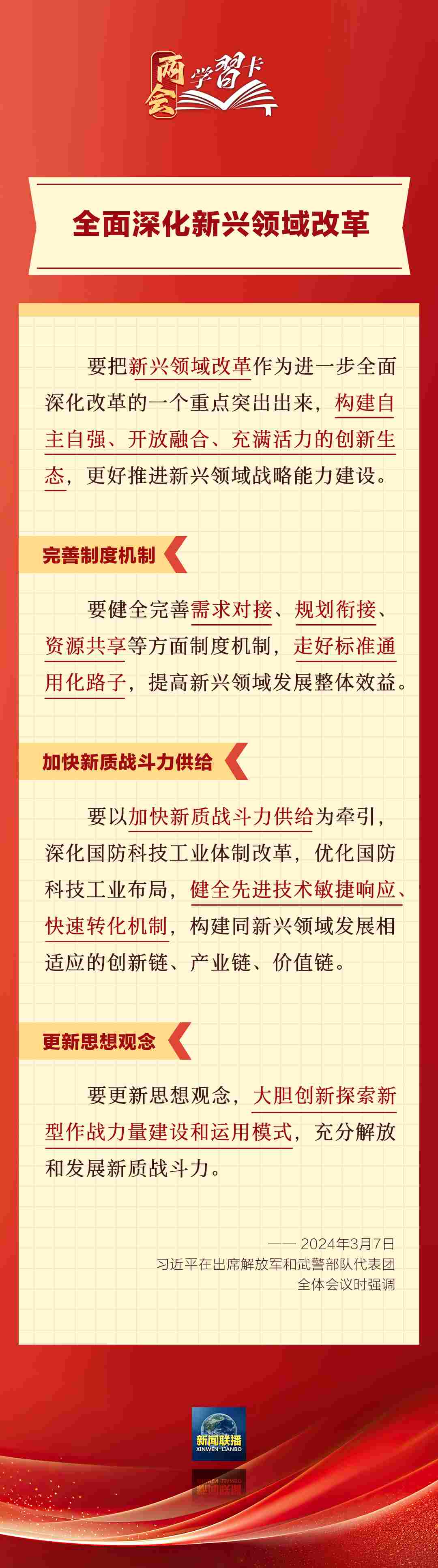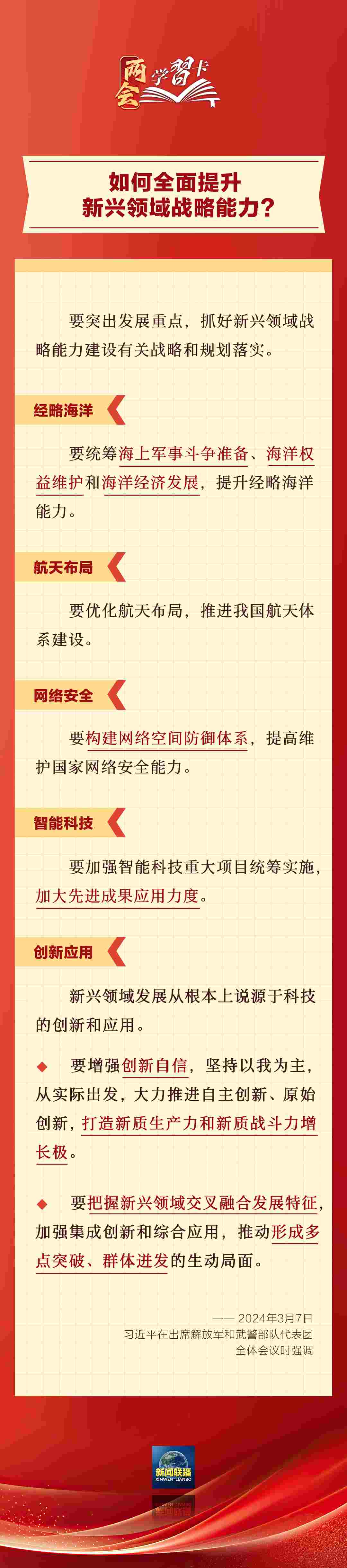 3月7日,習(xí)近平在出席解放軍和武警部隊代表團全體會議時強調(diào),強化使命擔(dān)當(dāng),深化改革創(chuàng)新,全面提升新興領(lǐng)域戰(zhàn)略能力。如何提升新興領(lǐng)域戰(zhàn)略能力?一起學(xué)習(xí)↓↓↓