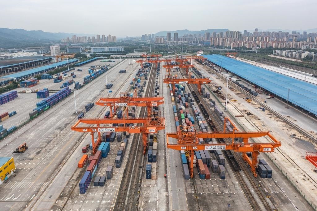 如今,“四向”物流通道在這里交匯:向西,中歐班列直達(dá)歐洲多國;向東,渝甬班列直抵寧波舟山港;向北,“渝滿俄”班列開行;向南,西部陸海新通道直達(dá)廣西欽州港,再通往世界多個(gè)國家和地區(qū)……