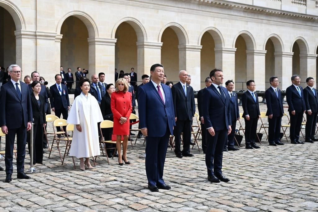 當(dāng)天下午,習(xí)近平在巴黎出席馬克龍舉行的隆重盛大歡迎儀式。兩國(guó)元首檢閱法蘭西共和國(guó)衛(wèi)隊(duì)和陸??杖妰x仗隊(duì),并觀看分列式。