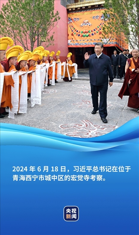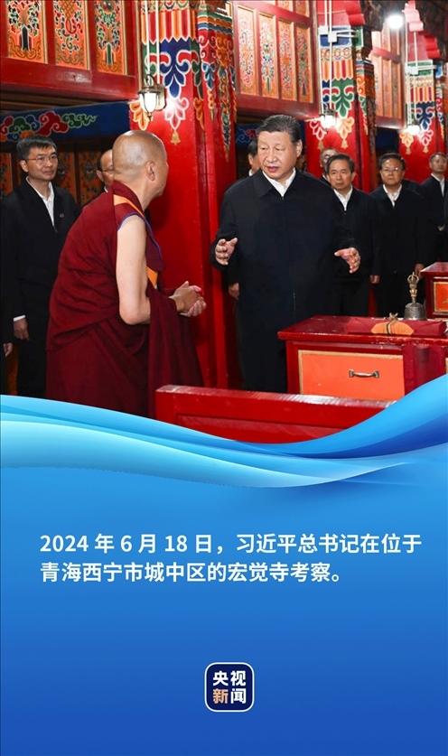 6月18日,正在青海考察的習(xí)近平總書記來到位于西寧市城中區(qū)的宏覺寺。在寺前院落,宏覺寺民主管理委員會負責(zé)人向總書記敬獻哈達,僧人提香爐、持寶傘迎接總書記。