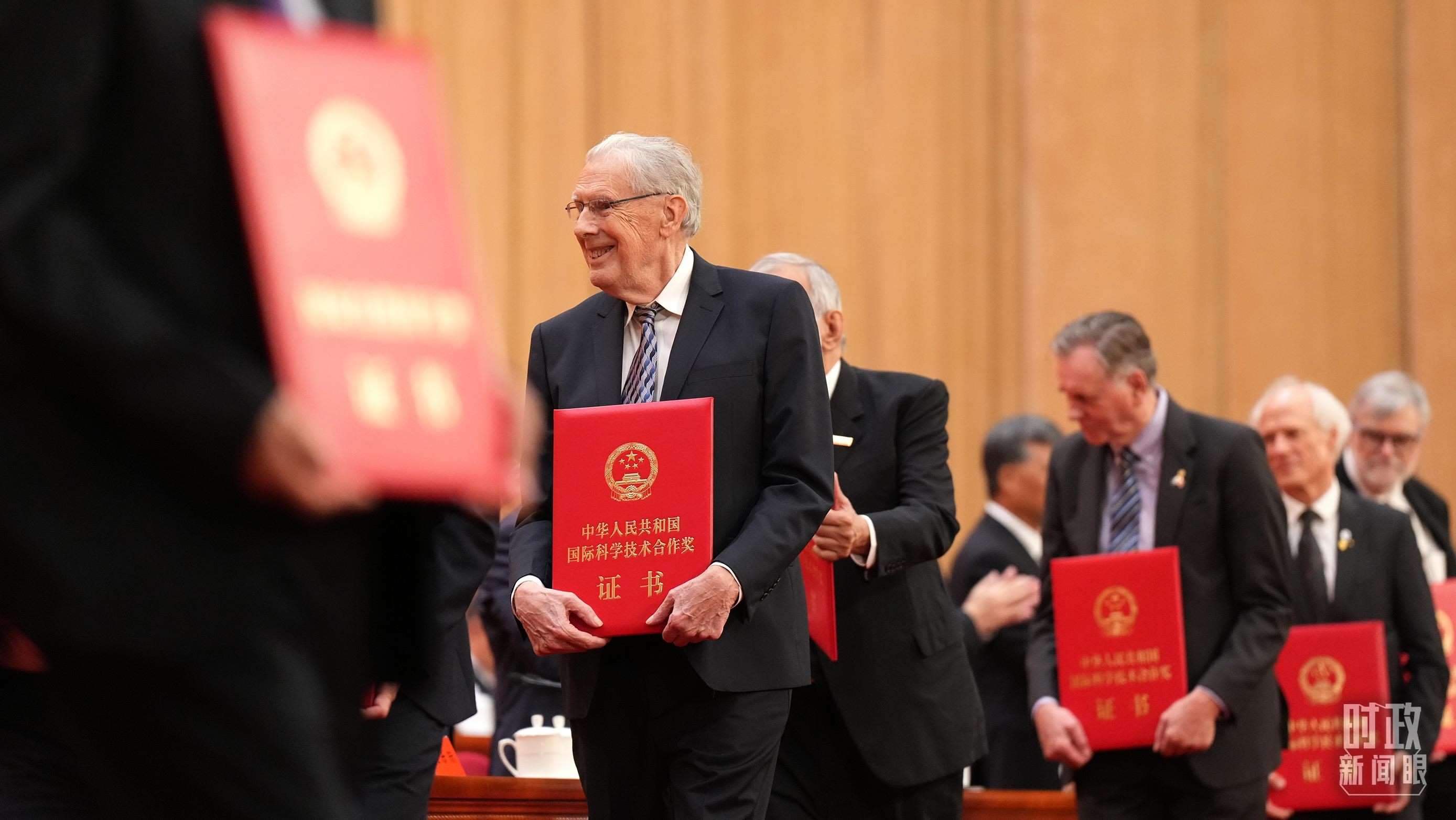 △獲獎(jiǎng)的外籍科技工作者,獎(jiǎng)?wù)碌谋趁婵逃蝎@獎(jiǎng)?wù)咝彰?。(總臺(tái)國(guó)廣記者李晉、央視記者姚瑤拍攝)