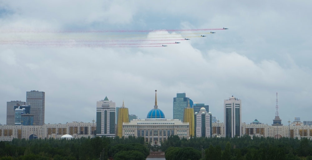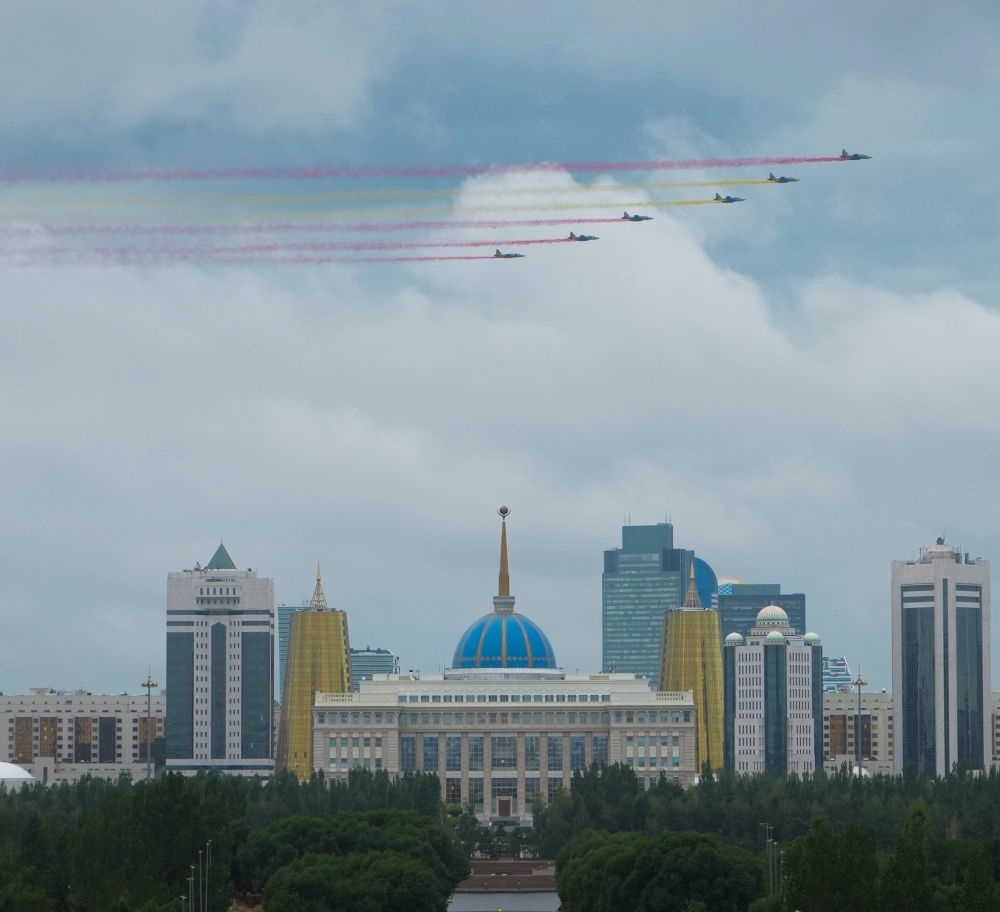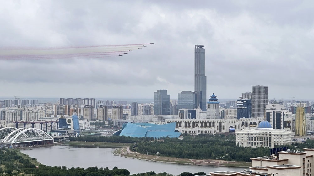 習近平主席抵達時,哈方多架戰(zhàn)機在總統(tǒng)府上空拉出中國國旗色彩煙歡迎中國貴賓。