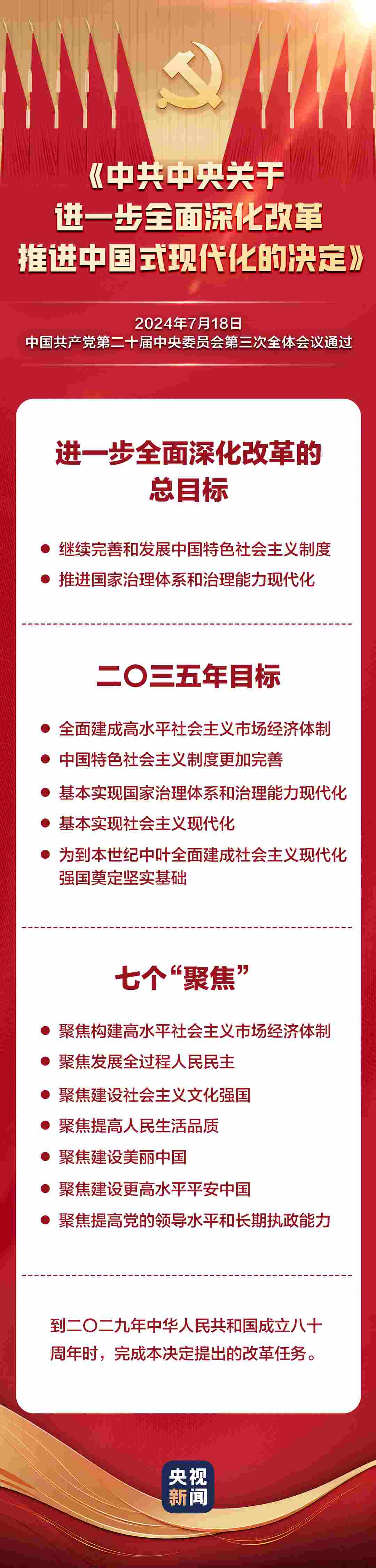 中國共產(chǎn)黨第二十屆中央委員會(huì)第三次全體會(huì)議,于2024年7月15日至18日在北京舉行。全會(huì)最重要的成果是審議通過《中共中央關(guān)于進(jìn)一步全面深化改革、推進(jìn)中國式現(xiàn)代化的決定》。《決定》共15部分、60條,分三大板塊,一文速覽: