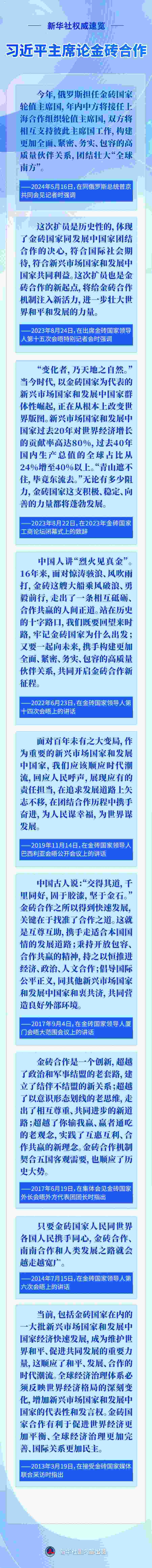 應(yīng)俄羅斯聯(lián)邦總統(tǒng)普京邀請,國家主席習(xí)近平將于10月22日至24日赴俄羅斯喀山出席金磚國家領(lǐng)導(dǎo)人第十六次會晤。今年是“大金磚合作”開局之年,此次會晤是金磚擴員后首次舉行,國際社會廣泛關(guān)注。近年來,習(xí)近平主席圍繞金磚合作作出一系列重要論述,一起重溫——