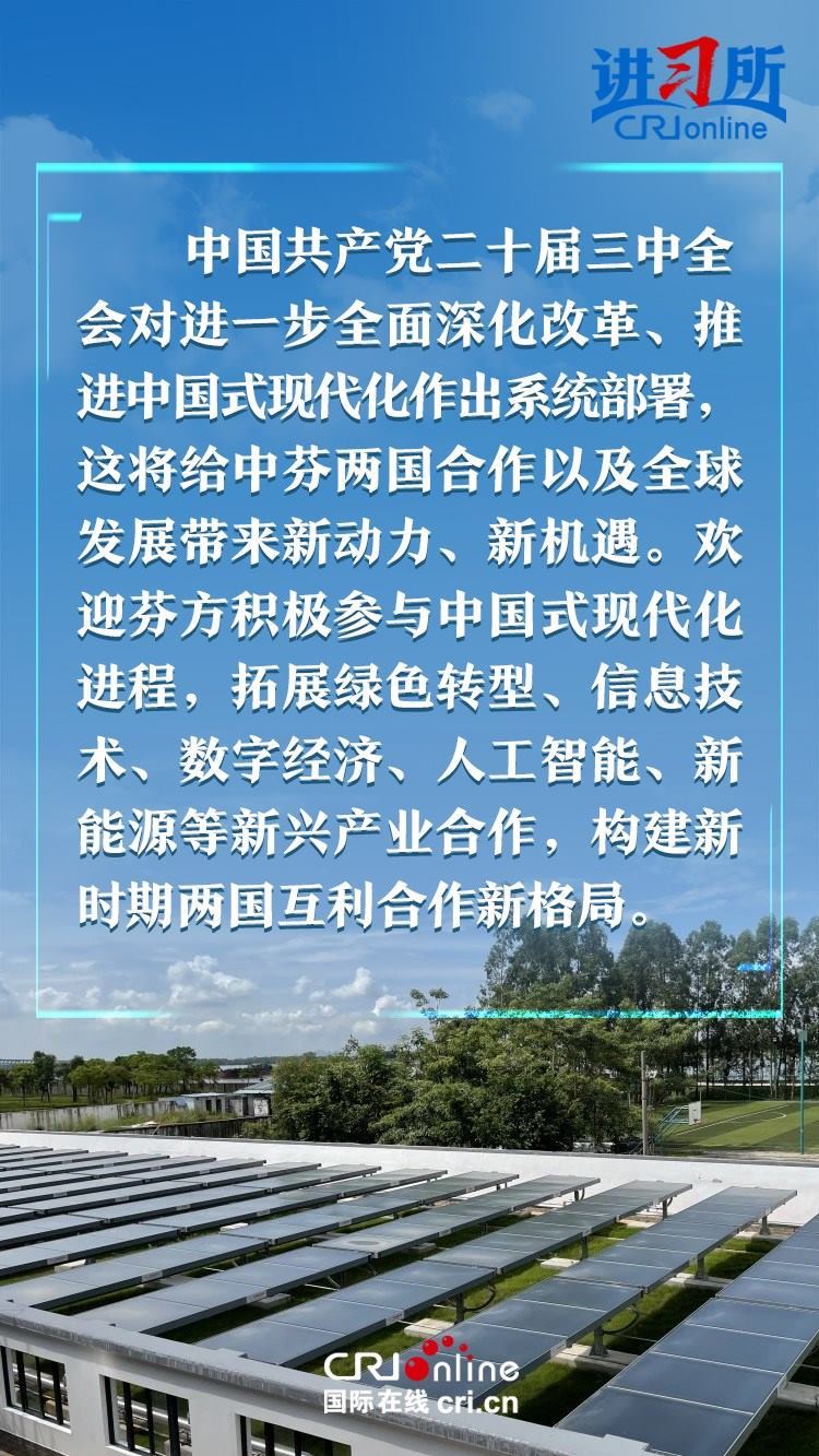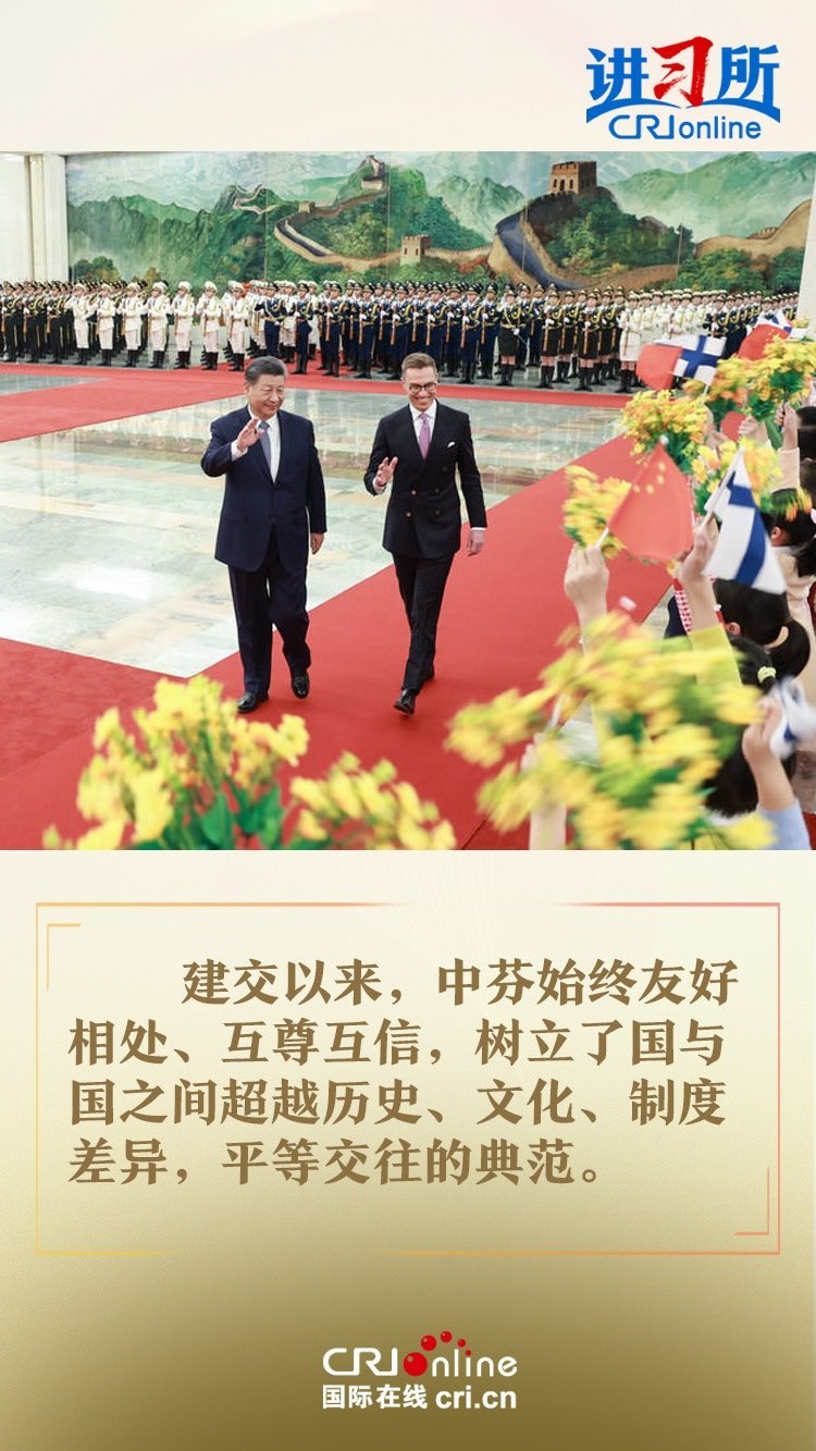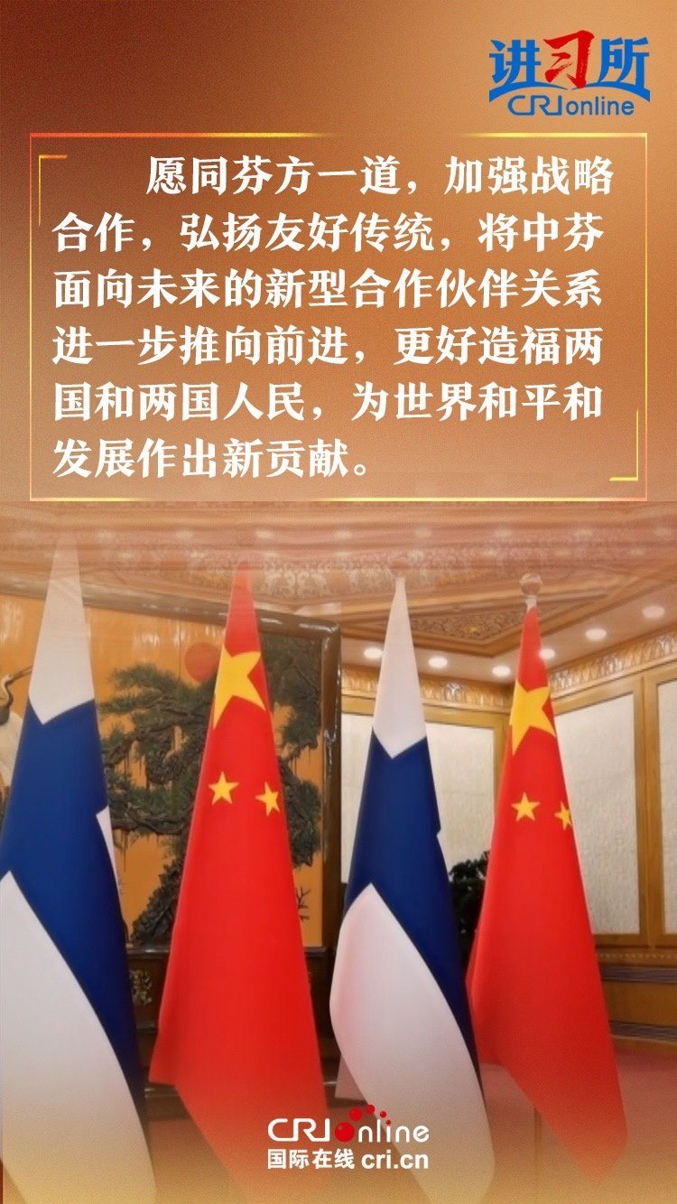 習(xí)近平指出,建交以來,中芬始終友好相處、互尊互信,樹立了國與國之間超越歷史、文化、制度差異,平等交往的典范。中方愿同芬方一道,加強戰(zhàn)略合作,弘揚友好傳統(tǒng),將中芬面向未來的新型合作伙伴關(guān)系進一步推向前進,更好造福兩國和兩國人民,為世界和平和發(fā)展作出新貢獻。