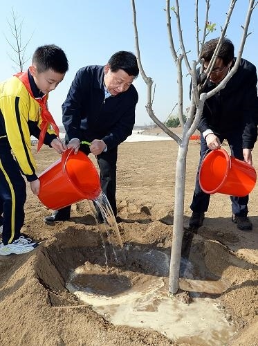 2014年4月,南水北調中線一期工程通水前夕,配套工程北京團城湖調節(jié)池迎來了種樹人習近平。在那里,他接連種下了6棵樹,植樹結束,還向工程負責人了解了南水北調水源的水質與保護等問題。