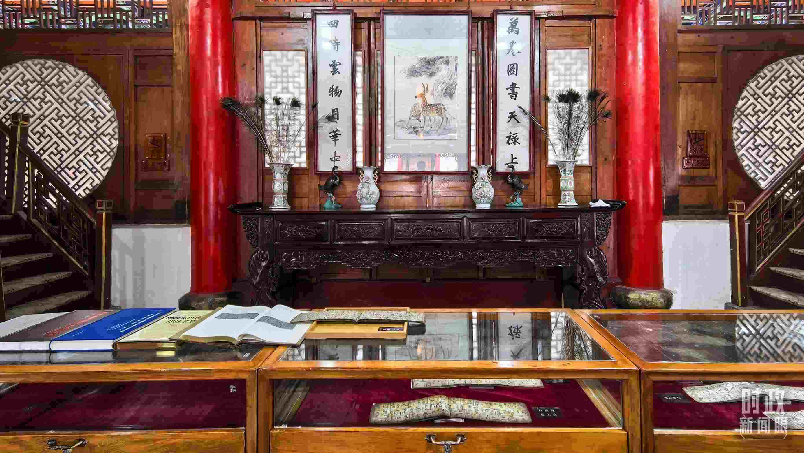 △木府萬(wàn)卷樓里的書(shū)籍和文物展陳。(總臺(tái)央視記者陸泓宇拍攝)