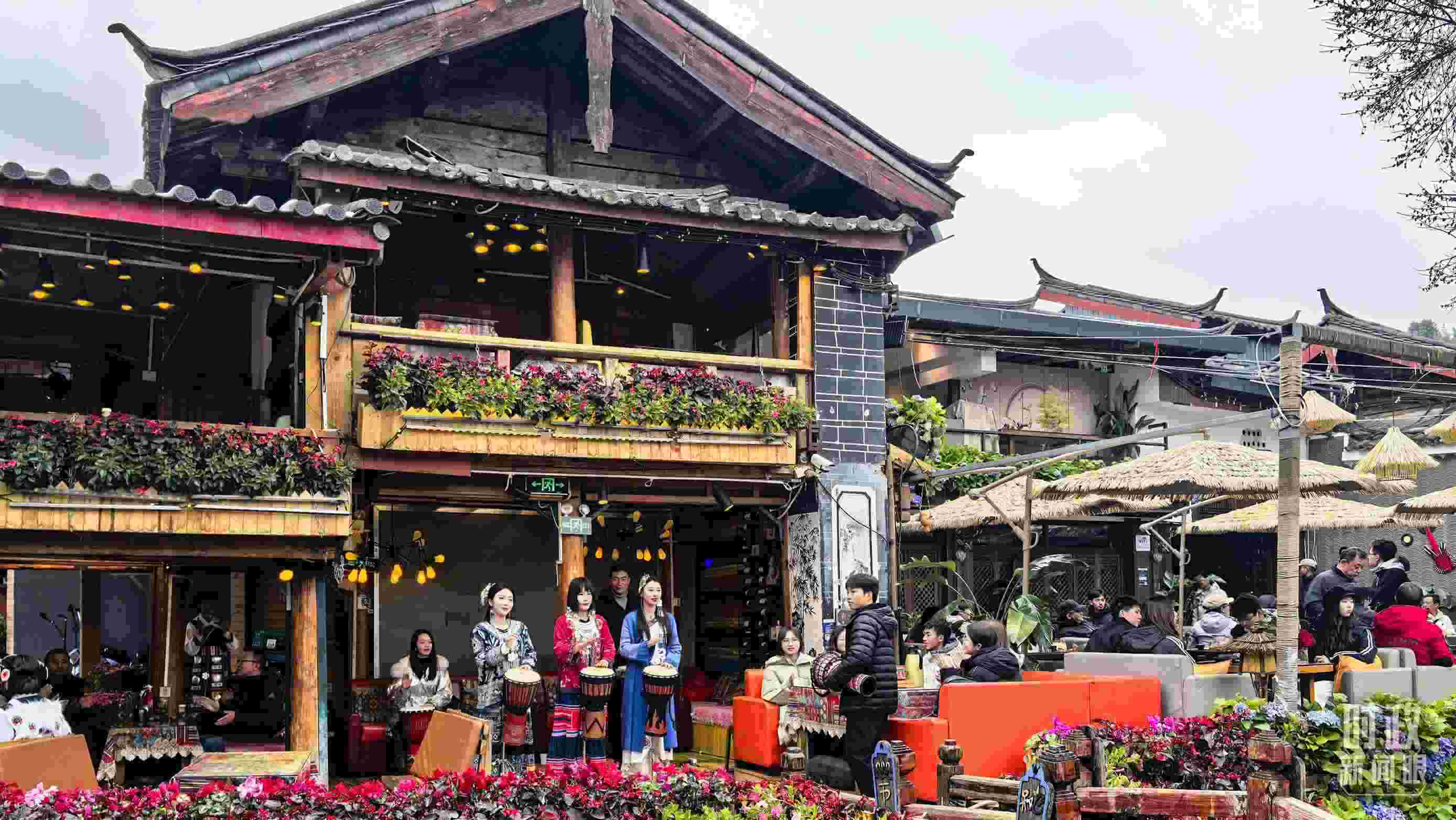 △古城商鋪門(mén)口的手鼓演奏。(總臺(tái)央視記者鄂介甫拍攝)