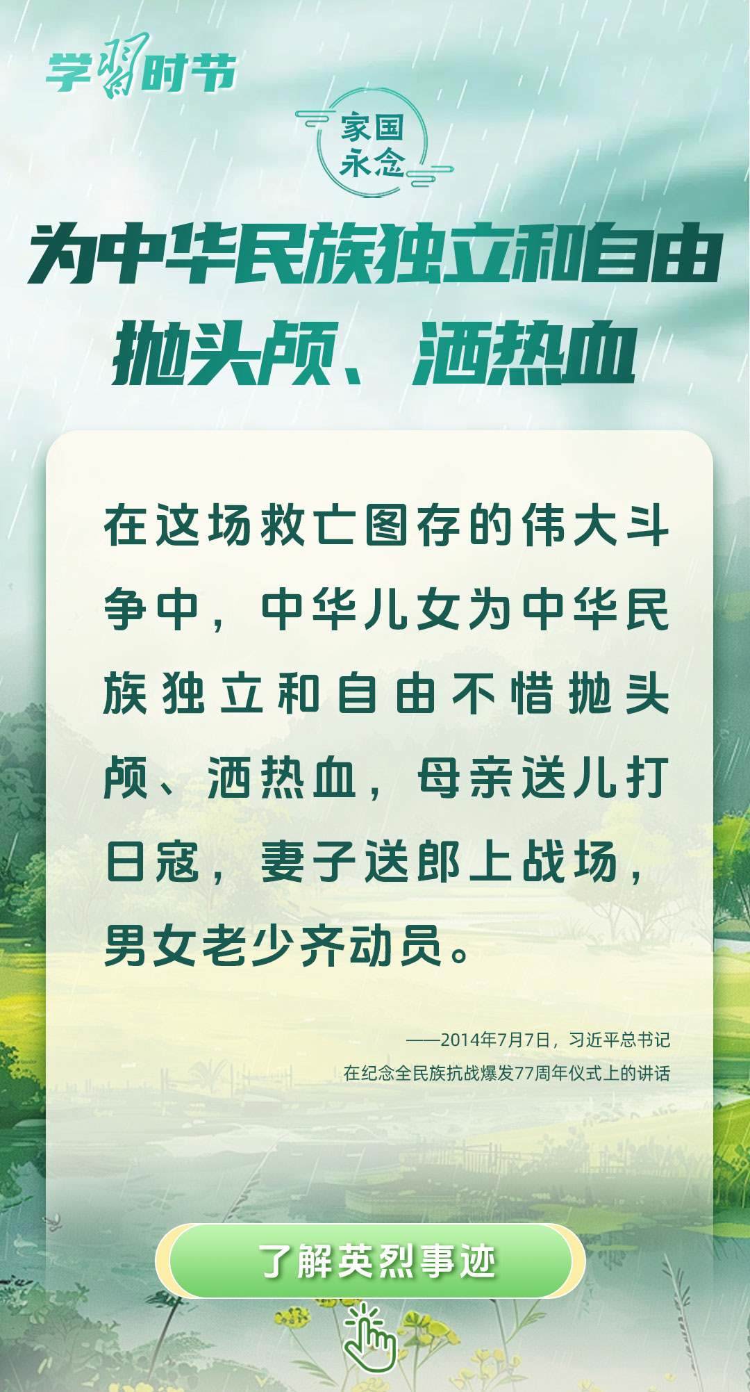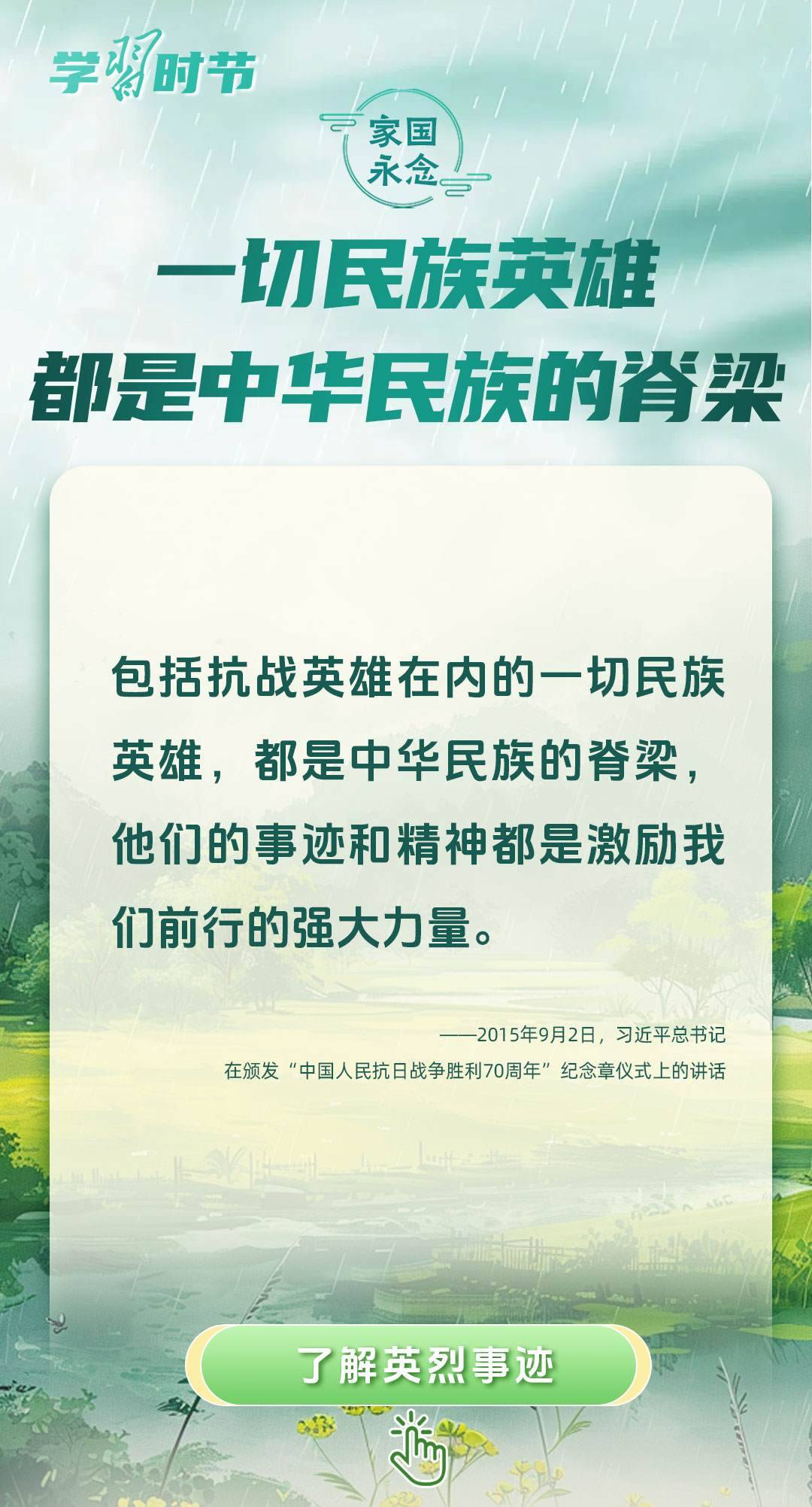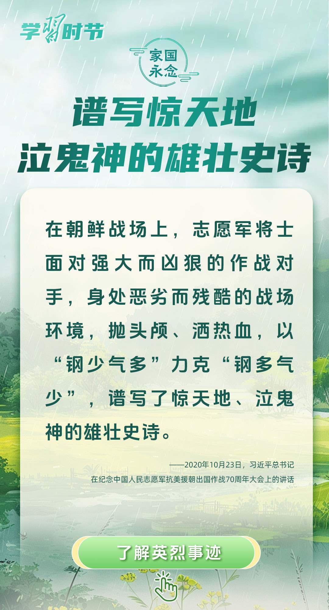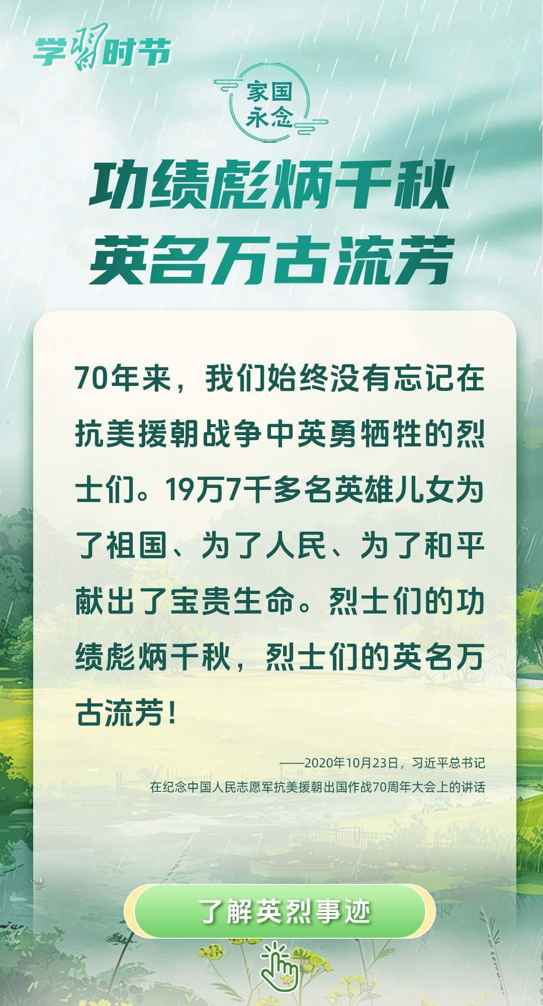 今年是中國(guó)人民抗日戰(zhàn)爭(zhēng)暨世界反法西斯戰(zhàn)爭(zhēng)勝利80周年、中國(guó)人民志愿軍抗美援朝出國(guó)作戰(zhàn)75周年。習(xí)近平總書(shū)記曾說(shuō):“對(duì)一切為國(guó)家、為民族、為和平付出寶貴生命的人們,不管時(shí)代怎樣變化,我們都要永遠(yuǎn)銘記他們的犧牲和奉獻(xiàn)。”今天我們所擁有的一切,無(wú)不凝結(jié)著英雄、英烈們的奉獻(xiàn)付出乃至巨大犧牲。