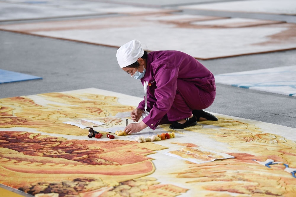青海湖畔翱翔的水鳥、雪山下起舞的藏族女孩……在圣源地毯集團有限公司車間內(nèi),手持電織槍的女工們,正按照設(shè)計圖織出精美立體的圖案。