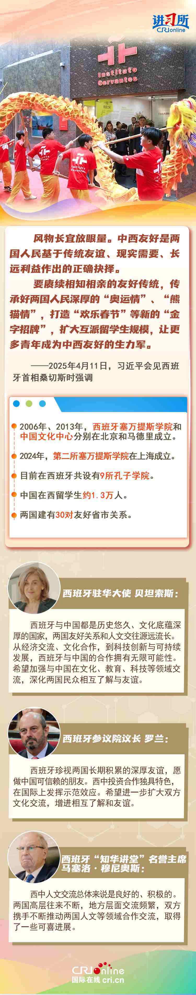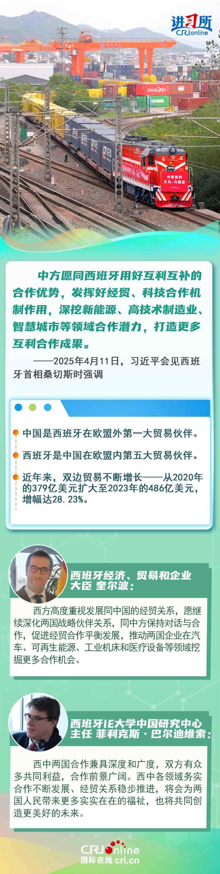 今年是中西全面戰(zhàn)略伙伴關(guān)系建立20周年,也是中歐建交50周年。多年來,中西兩國領導人保持密切互動,秉持互尊互信、互利共贏精神,兩國在深化貿(mào)易、投資、科技創(chuàng)新、綠色能源等領域取得豐富合作成果,雙邊關(guān)系走在中國同歐洲國家關(guān)系前列。在西班牙人士眼中,良好的對華關(guān)系對西班牙、歐洲和世界具有重要意義,將會為兩國人民帶來更多實實在在的福祉,也將共同創(chuàng)造更美好的未來。