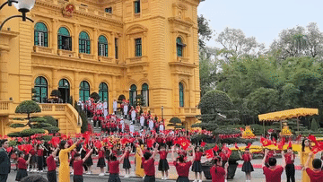主席府廣場(chǎng)上,五星紅旗同金星紅旗迎風(fēng)飄揚(yáng),200多名越南少年兒童揮舞旗幟,熱烈歡迎習(xí)近平到訪。