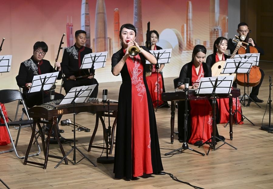 2023年11月24日,在馬來西亞雪蘭莪州的廈門大學(xué)馬來西亞分校,藝術(shù)家在音樂會(huì)上演奏。“絲路粵韻——廣東民族音樂會(huì)”當(dāng)晚在廈門大學(xué)馬來西亞分校舉辦。新華社記者程一恒攝