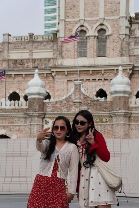 兩名來(lái)自中國(guó)云南的游客在馬來(lái)西亞首都吉隆坡地標(biāo)性歷史建筑蘇丹阿卜杜勒·薩馬德大廈前合影。人民日?qǐng)?bào)記者 俞懿春攝