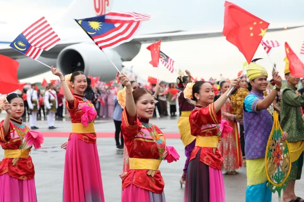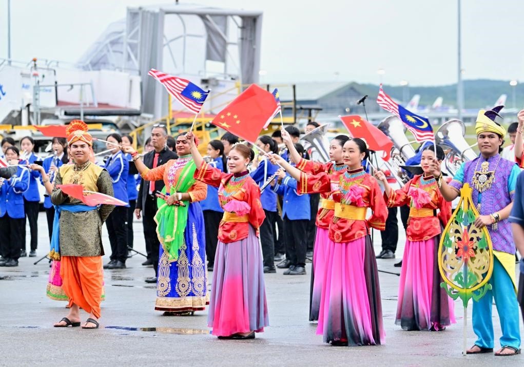 馬來(lái)西亞兒童向習(xí)近平獻(xiàn)花,馬來(lái)西亞青少年表演富有當(dāng)?shù)靥厣奈璧?,揮舞中馬兩國(guó)國(guó)旗,熱烈歡迎習(xí)近平到訪。