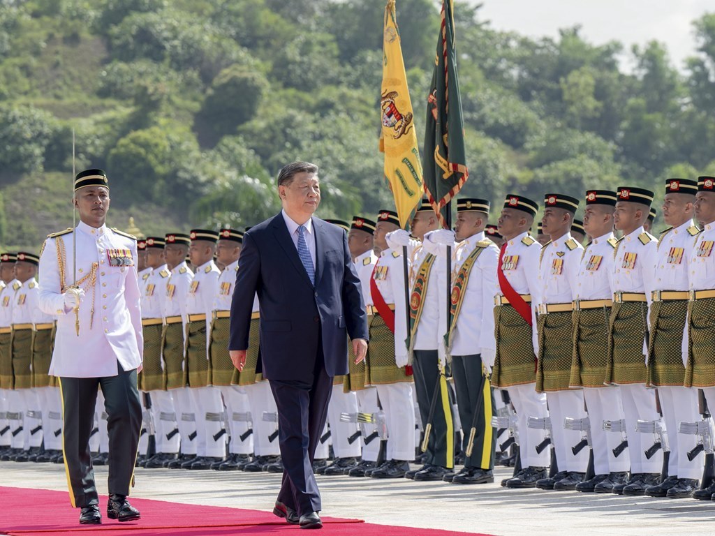 4月16日上午,易卜拉欣在馬來(lái)西亞國(guó)家王宮廣場(chǎng)為習(xí)近平舉行隆重歡迎儀式。