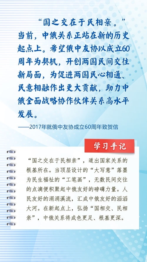 中華民族和俄羅斯民族都有悠久的歷史、古老的文明、燦爛的文化,都是偉大的民族。近年來,習(xí)近平主席常常引用中國詩詞古語、俄羅斯諺語名言等,寄語中俄關(guān)系發(fā)展和全人類和平與發(fā)展。這些重要論述,蘊(yùn)含對文明、歷史的深邃思考,指引著新時代的中俄關(guān)系不斷向前,為世界百年變局中的人類文明進(jìn)步事業(yè)指明方向。