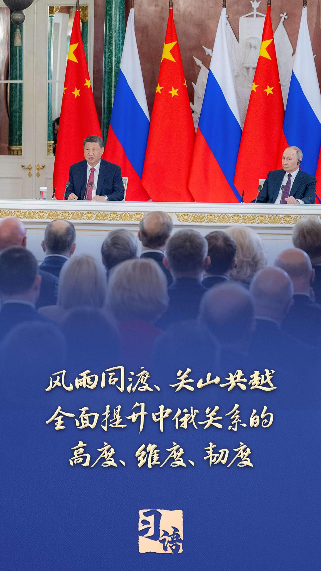 “面對(duì)變亂交織的國(guó)際形勢(shì),中俄兩國(guó)要堅(jiān)定秉持永久睦鄰友好、全面戰(zhàn)略協(xié)作、互利合作共贏精神,風(fēng)雨同渡、關(guān)山共越,全面提升中俄關(guān)系的高度、維度、韌度,為世界和平和安全注入更多穩(wěn)定性,為全球發(fā)展繁榮提供更強(qiáng)推動(dòng)力?!碑?dāng)?shù)貢r(shí)間5月8日,習(xí)近平在同俄羅斯總統(tǒng)普京共同會(huì)見記者時(shí)指出。