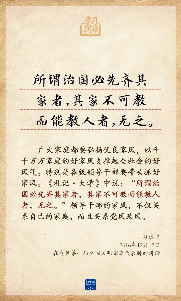 家風(fēng)是社會風(fēng)氣的重要組成部分。習(xí)近平總書記始終重視家庭、家教、家風(fēng)建設(shè),多次在重要場合引經(jīng)據(jù)典話家風(fēng)。5月15日是國際家庭日,我們選取總書記相關(guān)重要論述,品讀其中深意。