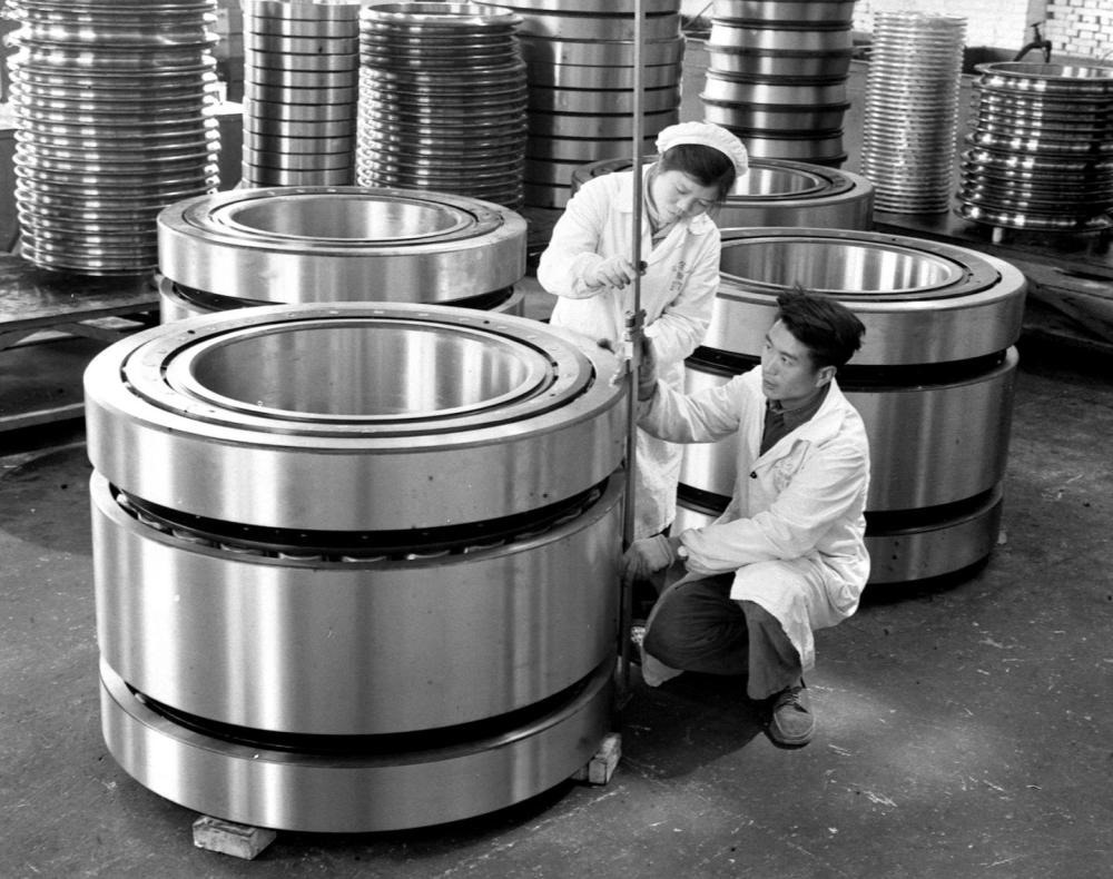 1966年,洛陽軸承廠檢驗(yàn)員在細(xì)心檢查即將出廠的一批特大型軸承的質(zhì)量。