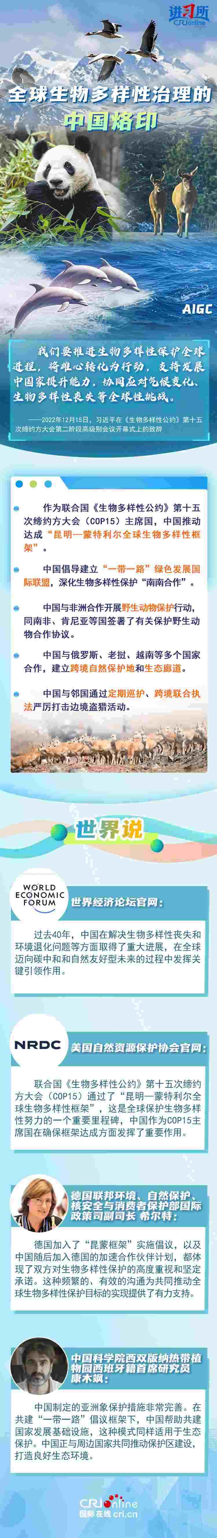 “心往一處想、勁往一處使,共建地球生命共同體?!弊鳛樽钤绾炇稹⑴鷾?zhǔn)《生物多樣性公約》的締約方之一,生物多樣性保護(hù)已經(jīng)上升為中國的國家發(fā)展戰(zhàn)略。國際人士表示,中國的一系列舉措體現(xiàn)出對(duì)生態(tài)環(huán)境保護(hù)的堅(jiān)定決心,同時(shí),中國依托共建“一帶一路”倡議等國際合作機(jī)制,為推動(dòng)全球生物多樣性保護(hù)提供了有力支持,在邁向自然友好型未來的過程中發(fā)揮關(guān)鍵的引領(lǐng)作用。