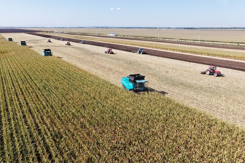2025年9月23日,在位于雙鴨山市的黑龍江北大荒農(nóng)業(yè)股份有限公司友誼分公司一旱田地塊,大型農(nóng)業(yè)機械在進(jìn)行玉米收獲作業(yè)(無人機照片)。新華社記者 王松 攝