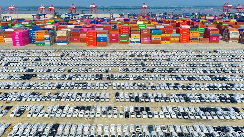 2025年10月4日在江蘇省港口集團南京港龍?zhí)陡蹍^(qū)拍攝的準備裝船出口的汽車(無人機照片)。新華社發(fā)(楊素平?攝)