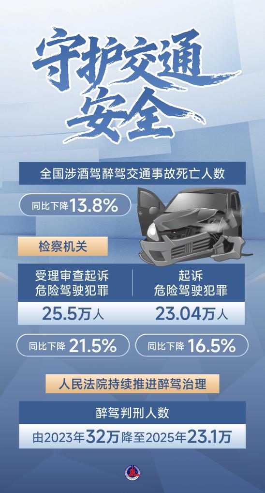 最高法報告指出,辦理醉駕刑事案件意見出臺后,判刑人數(shù)由2023年32萬降至2025年23.1萬,因酒駕造成交通事故及致死、致傷數(shù)量均有下降。同時,明確“駕駛?cè)俗砭坪髥⒂幂o助駕駛功能仍應承擔刑事責任”?! ?/p>