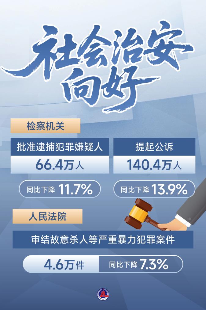 ——社會治安向好,檢察機關(guān)批捕、起訴人數(shù)均同比下降10%以上。
