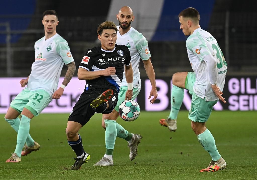 2021年3月10日,當時效力于比勒菲爾德隊的日本球員堂安律(前左)在德甲比賽中帶球突破。他現(xiàn)在效力于德甲弗賴堡俱樂部。新華社發(fā)(烏爾里?!ず蚣{格爾 攝)