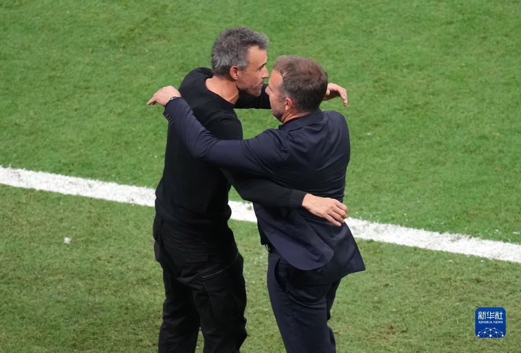 11月27日,德國(guó)隊(duì)主教練漢斯·弗利克(右)與西班牙隊(duì)主教練路易斯·恩里克在比賽后相互致意。新華社記者 陳誠(chéng) 攝