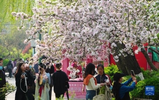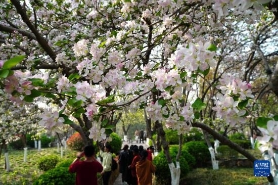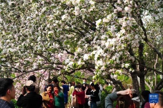 3月21日,在濟(jì)南市五龍?zhí)豆珗@,人們觀賞盛開的海棠花。