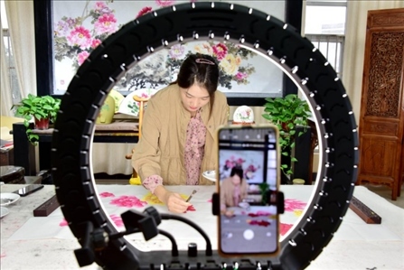 河南省洛陽(yáng)市孟津區(qū)平樂(lè)鎮(zhèn)中國(guó)牡丹畫創(chuàng)意園區(qū),村民正在通過(guò)網(wǎng)絡(luò)直播推介牡丹畫。李衛(wèi)超攝