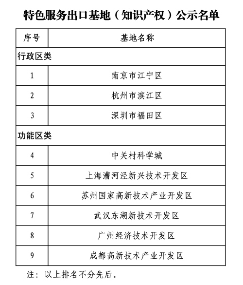 據(jù)國(guó)家知識(shí)產(chǎn)權(quán)局官網(wǎng)消息,根據(jù)《商務(wù)部等7部門(mén)辦公廳(室)關(guān)于組織申報(bào)專(zhuān)業(yè)類(lèi)特色服務(wù)出口基地的通知》(商辦服貿(mào)函〔2021〕355號(hào))要求,經(jīng)地方申報(bào)、省市知識(shí)產(chǎn)權(quán)和商務(wù)主管部門(mén)初審?fù)扑]、第三方機(jī)構(gòu)客觀指標(biāo)評(píng)審、專(zhuān)家評(píng)審、部門(mén)工作組復(fù)核等程序,初步認(rèn)定知識(shí)產(chǎn)權(quán)服務(wù)出口基地9家,名單于2月7日-2月11日進(jìn)行公示。