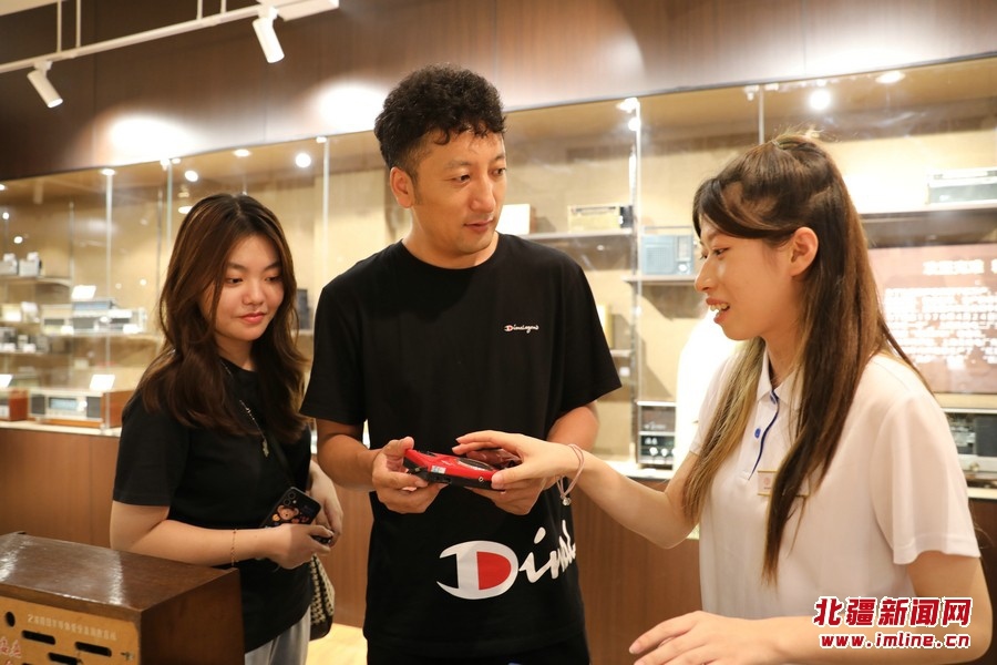 8月17日,游客在內(nèi)蒙古包頭市固陽縣“固陽稒事”美食特產(chǎn)文創(chuàng)街的收音機收藏館參觀。