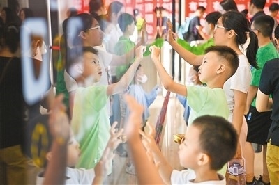 小朋友們?cè)谏轿髯匀徊┪镳^電子屏前參與互動(dòng)小游戲。新華社記者 楊晨光攝